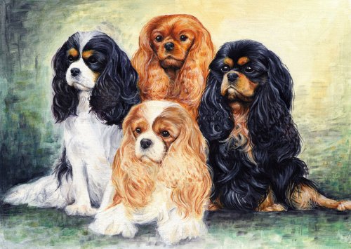 - Blenheim: Syté kaštanové znaky navzájem dobře oddělené, na perlově bílém podkladu. Znaky rovnoměrně rozložené na hlavě, ponechávají dostatek prostoru mezi ušima na vysoce ceněný znak ve tvaru kosočtverce (jedinečný charakteristický znak plemene).
